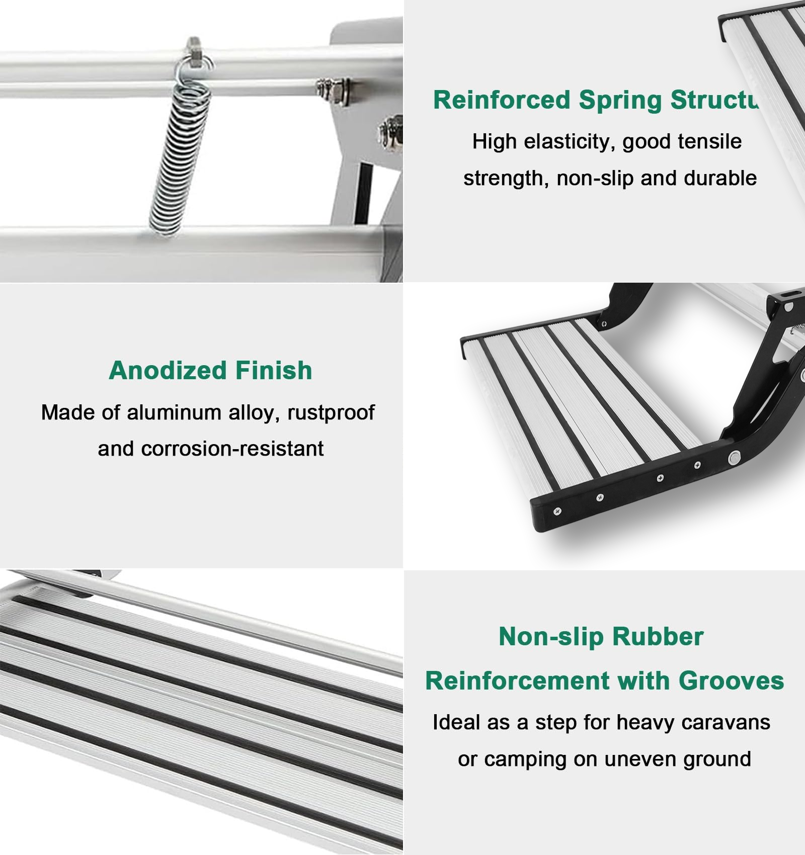 - Weather-Resistant Aluminum Construction:Made of oxidized aluminum alloy (IP67-rated), rust-proof & corrosionresistant - Ideal as RV entry steps or camper step stool in rain, snow, and mud